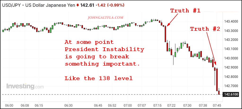 As yours truly stated in the chart above, one day, one Truth too many, and one angering of our trade partners to the point of current no return, and the President will break down below long term technical support levels creating a real financial crisis the markets will not be able to repair for months or years.