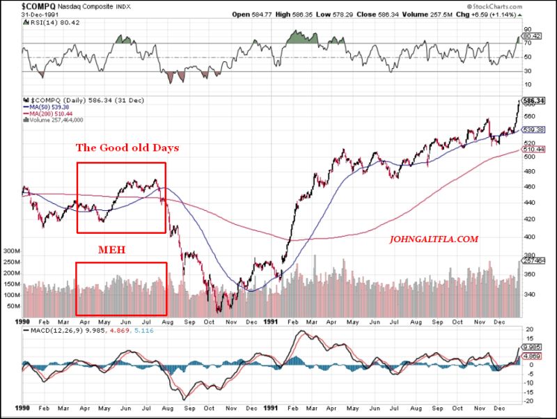 Not even a capital “meh” just meh. As in bland. Listless. No volume. No commitment. Big moves like this past Friday’s Dow +700 on one of the worst volume days in memory. Breadth is still just marginal at best and there appears there might be a follow through fake out, but the reality is that those of us who are of the historian type have seen this movie before.