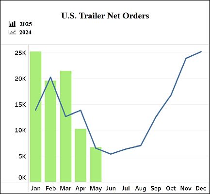 Trailer net orders last month declined 34% month-over-month to 6,738 units, exceeding normal seasonal trends, according to FTR Transportation Intelligence.