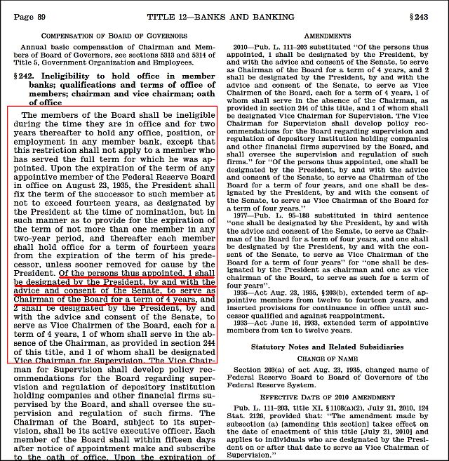 For those that do not read, watch, or study history the legal application of how the US President selects a new Federal Reserve Chairman is fairly strict. Meet 12, US Code Section 242: