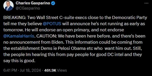 NEW — "According to my sources, President Biden agreed to step down as the Democratic nominee. It will happen as early as this weekend…"