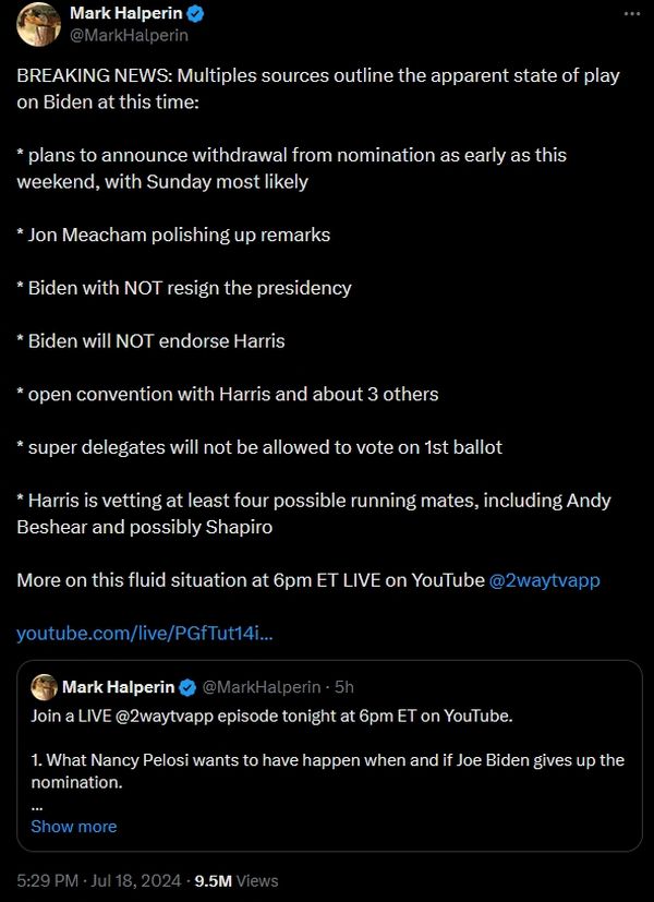 For example, Mark Halperin, a very liberal reporter inside the halls of power of the Democrat party posted the following on X (Twitter):