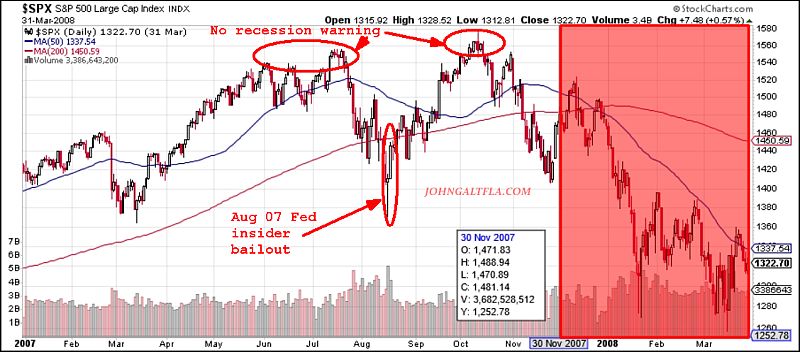 The S&P 500, despite a rocky road after some mortgage companies failed along with a sudden surge in bank failures offered no indication that an economic contraction might occur in December of 2007: