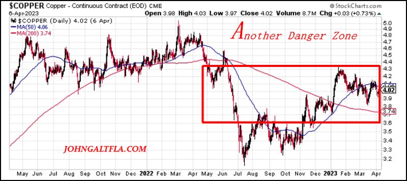 If Copper drops below 3.60 then we are heading into some serious disinflation then deflation this time in concert with a US slowdown. Above 4.40 and another run towards 5+ is possible along with a massive move in precious metals as it means that inflation, sustained sticky inflation, is here to stay for a while.
