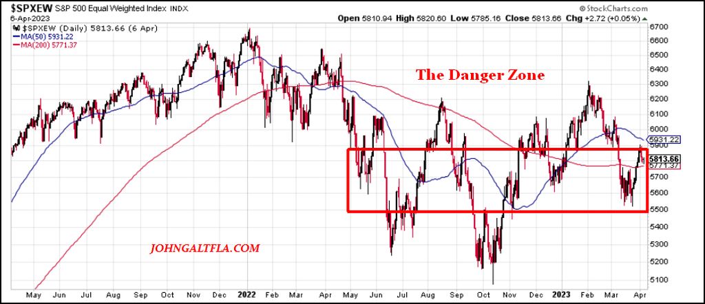 The one chart I like to watch for directional change in equities has been the equal weighted S&P 500. It provides a better flavor as to where the market is moving, in my opinion, with enough diversity within the calculations to provide a hint as to the investor’s preferences.