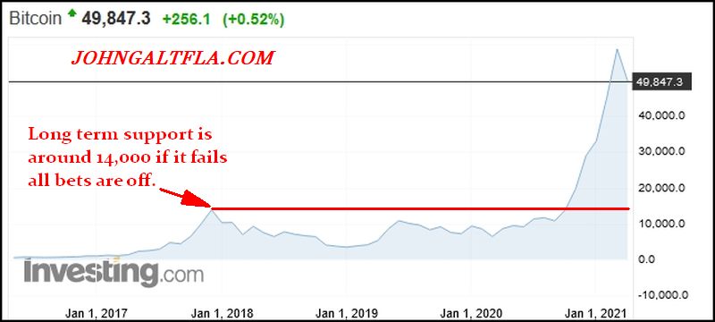 $13,850 was the major peak just before the 2018 “crash” and once again this parabolic move is not a validation of Bitcoin as the future but in fact an indication of the massive loss of faith in fiat currencies and governments on a global scale. The problem most end users do not realize is that if I owned Bitcoin at $100.00 then bought a new Tesla at $50,000 with Bitcoin, not only do I have to pay sales tax on the vehicle (plus other fees) but a capital gains tax for the realization of my profits. Thus the average buy and hold yutes who think their DOGEcoin is going to make them filthy rich do not understand that to use those profits, the taxman has to be paid and losing it all does not mean the same taxman will bail them out.