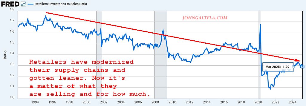 The facts are that since the 1990’s, retailers have improved their inventory to sales ratio to about as clean as it ever can be outside of the post-pandemic shortages. The trade war threat is still hanging over their head but the reality to Target is pretty ugly.