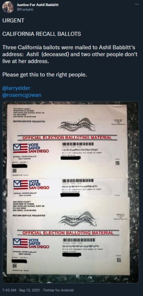 Three California ballots were mailed to Ashli Babbitt's address: Ashli (deceased) and two other people don't live at her address.