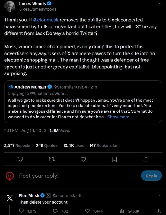 Thus the exchange below between renowned Twitter conservative and actor James Woods and Elon Musk sums up as to where this is going.