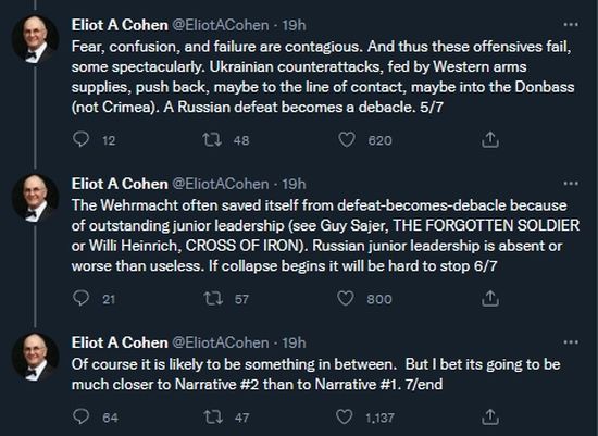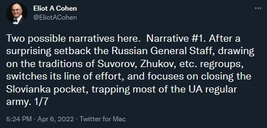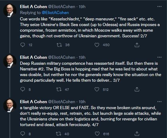 Even though the Kremlin has gone somewhat silent, I’m sure that certain Generals who over promised and got their forces mauled means that odds are several of those officers are now out of power and new more intelligent soldiers have replaced them. Thus the new strategy might look something like this Tweet thread by Eliot A. Cohen which is a must read: