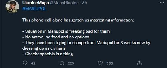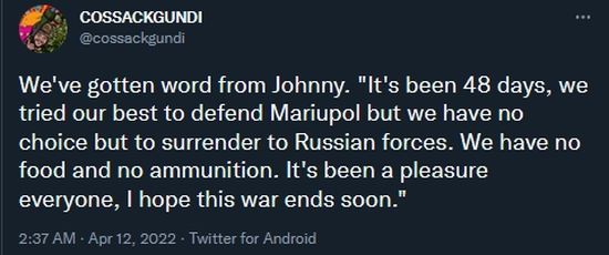 The following messages are from the Twitter user COSSACKGUNDI, a British national who joined the Ukrainian marines and has been fighting the Russians in Mariupol for many years now.