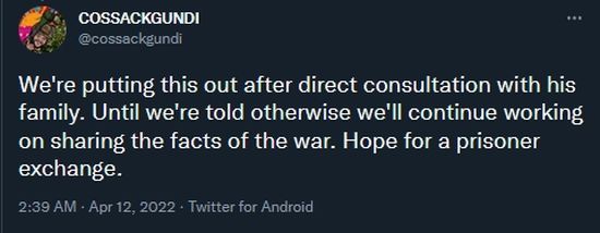 As regular readers know, I was quoting his Twitter feed when he was able to post throughout the prewar period and during the war. His interviews on British television were widely seen thus he does have a certain political value as a POW for the Russians.