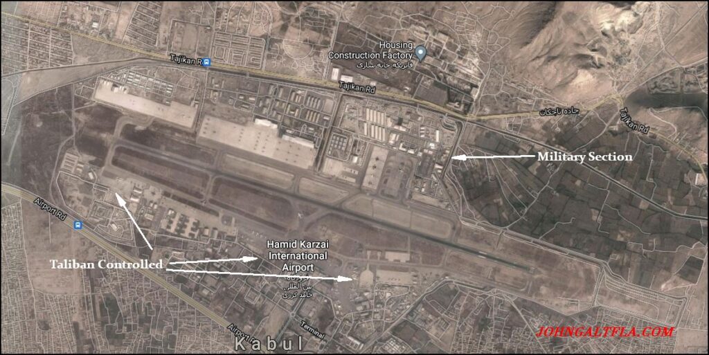 With every 300, 600, 1,000 troops we bring into the airport food, water, medical supplies, and other supplies must follow. If ammunition suddenly becomes a need, God help them. Despite a hardened position in some parts of the Hamid Karzai International Airport where the military aircraft are taking off and landing, the civilian side is now under control of the Taliban. The satellite picture above illustrates that this is not an ideal position to be in for a prolonged military defense position.