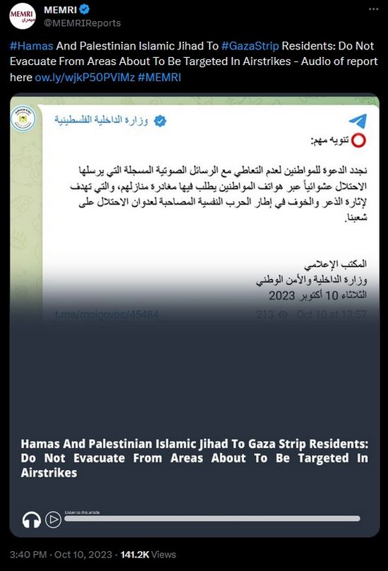 Then MEMRI, a group I am quite familiar with over the past decades which translates Arabic and Farsi (Persian) language local outlets into English for Western readers and listeners posted this on Twitter/X:
